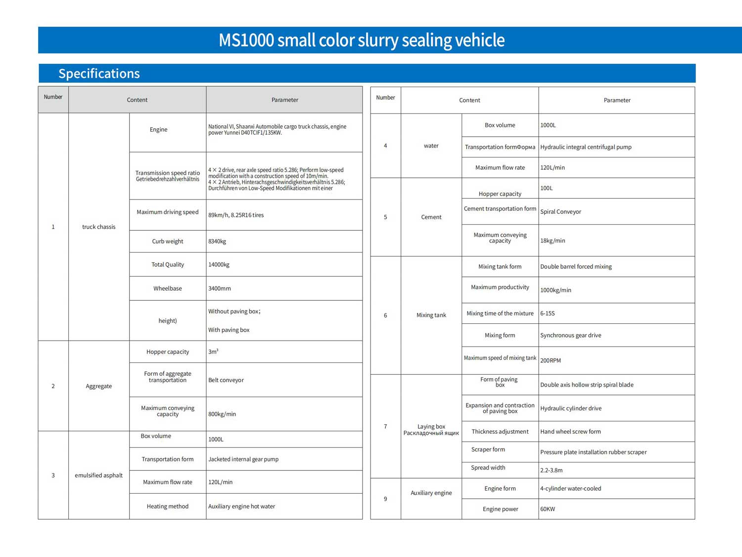 Equipped with an auxiliary engine for powering heating and pumping systems, the MS1000 supports continuous operation in diverse conditions. The rubber scraper and pressure plate assembly ensures smooth, even slurry application, ideal for repairing cracks or resurfacing roads. Compact yet versatile, this vehicle is tailored for urban and small-scale road maintenance projects, combining reliability, automation, and ease of operation.