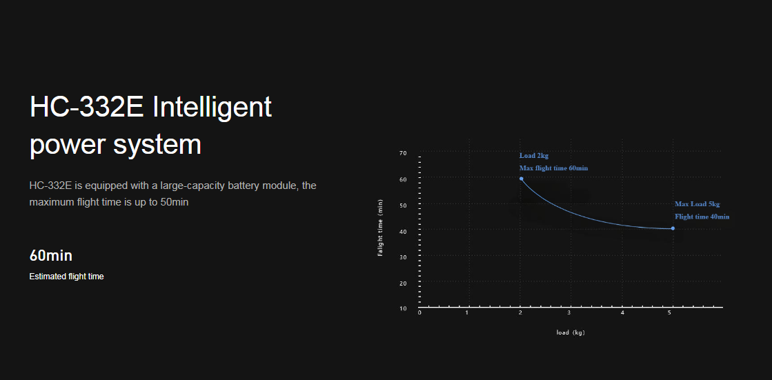 The HC-332E is a high-reliability, long-endurance electric multi-rotor UAV designed for demanding industrial applications. Powered by an advanced semi-solid lithium battery, it delivers up to 60 minutes of flight time and a 5kg payload capacity. With a proven record of 500 hours of failure-free operation, the HC-332E seamlessly integrates with AI-powered electro-optical cameras, oblique sensors, and RTK modules for precise power inspection, firefighting, and 3D surveying.